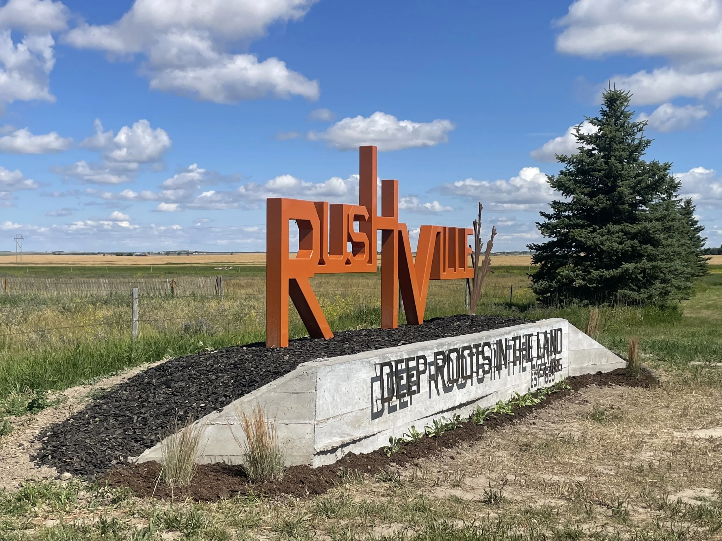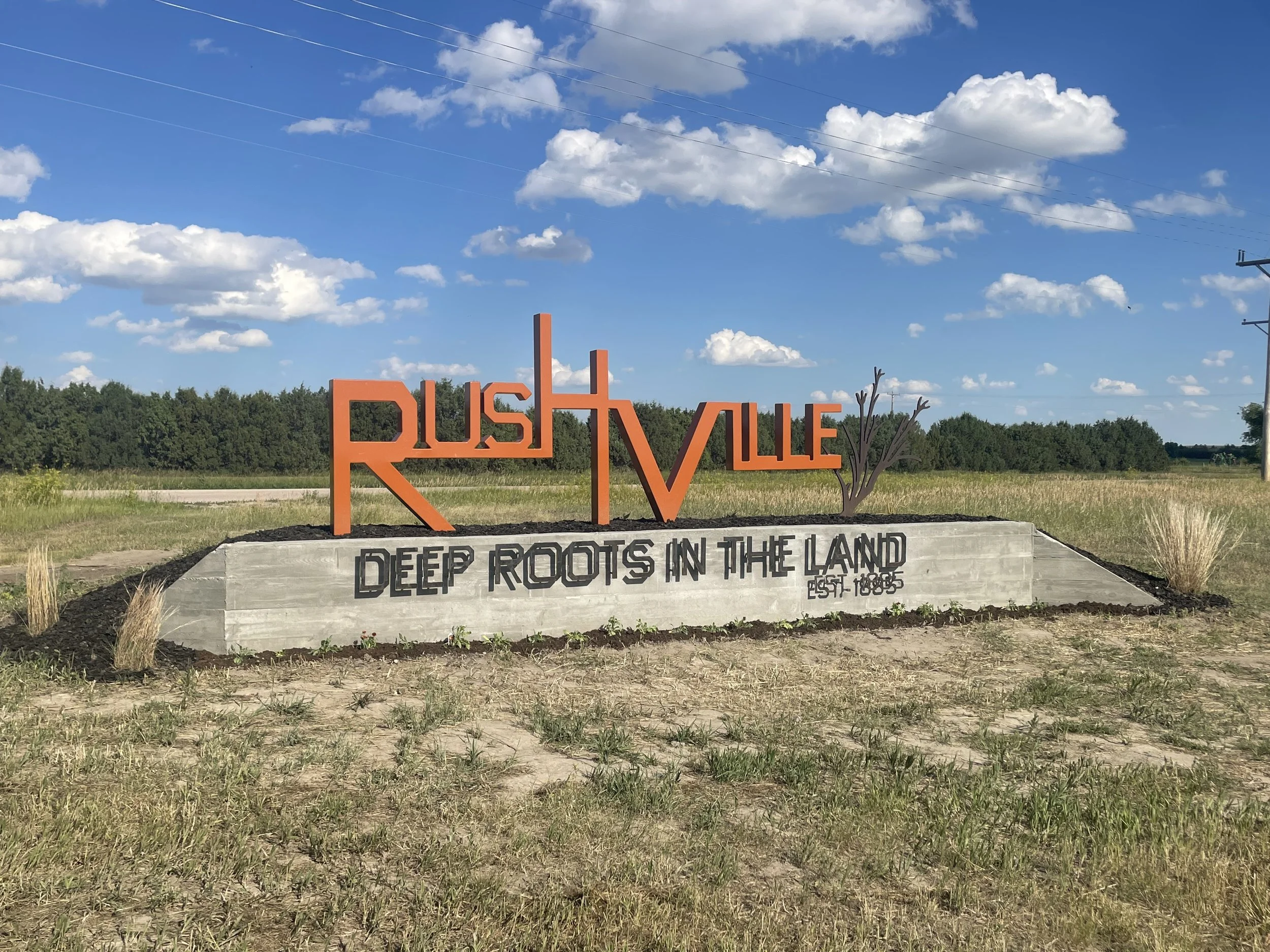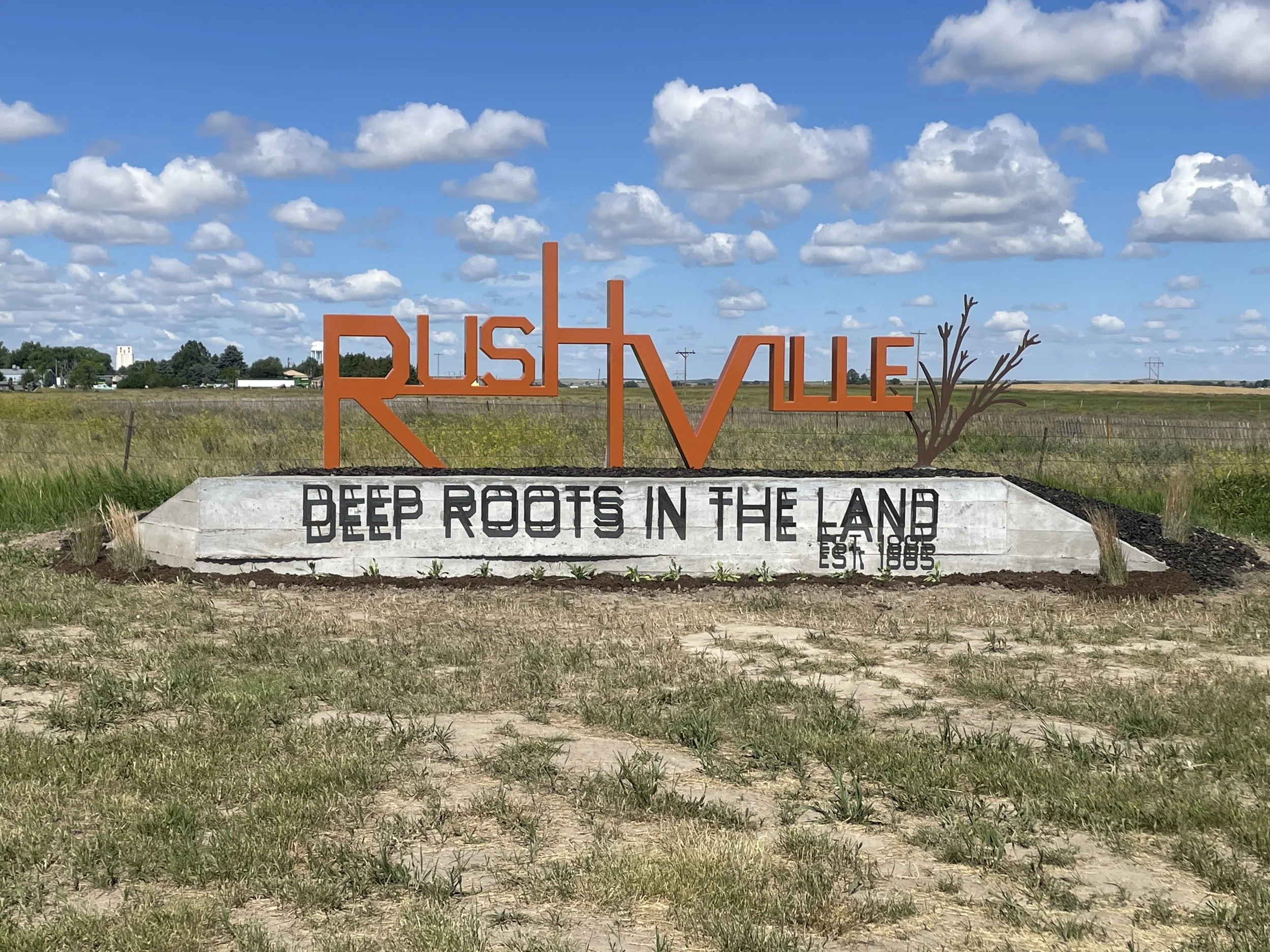 Kayla Meyer, a landscape architect based out of Omaha and our 2015 Artist Fellow, partnered with the Chamber to design the sign, which aims to connect Rushville to its "Deep Roots in the Land."